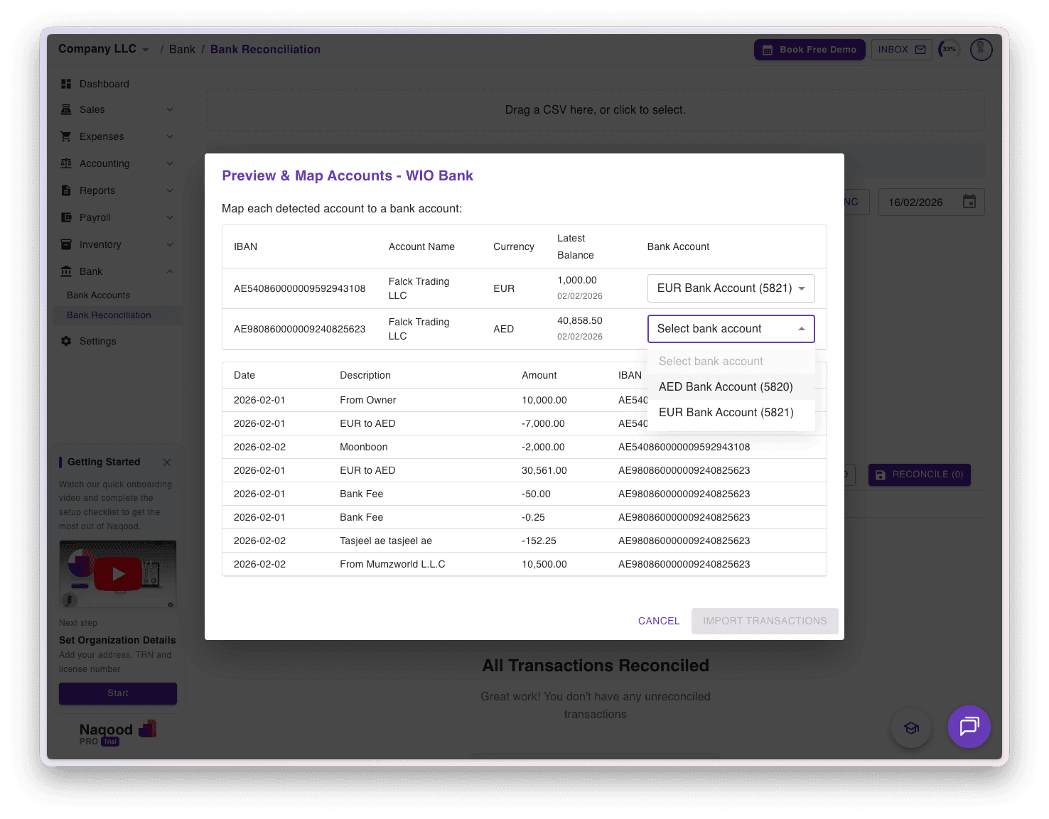 Match the bank accounts from the statement to your Naqood accounts (based on currency)