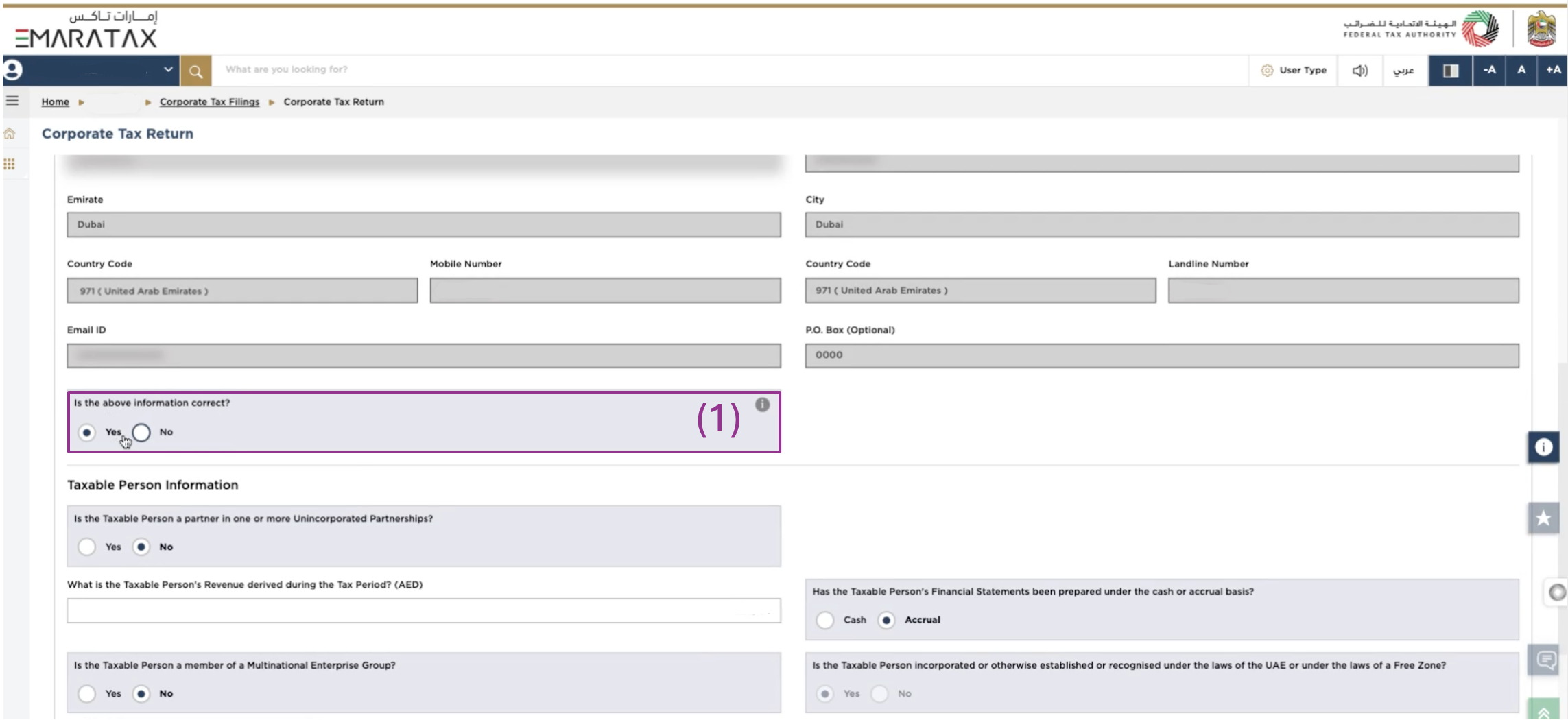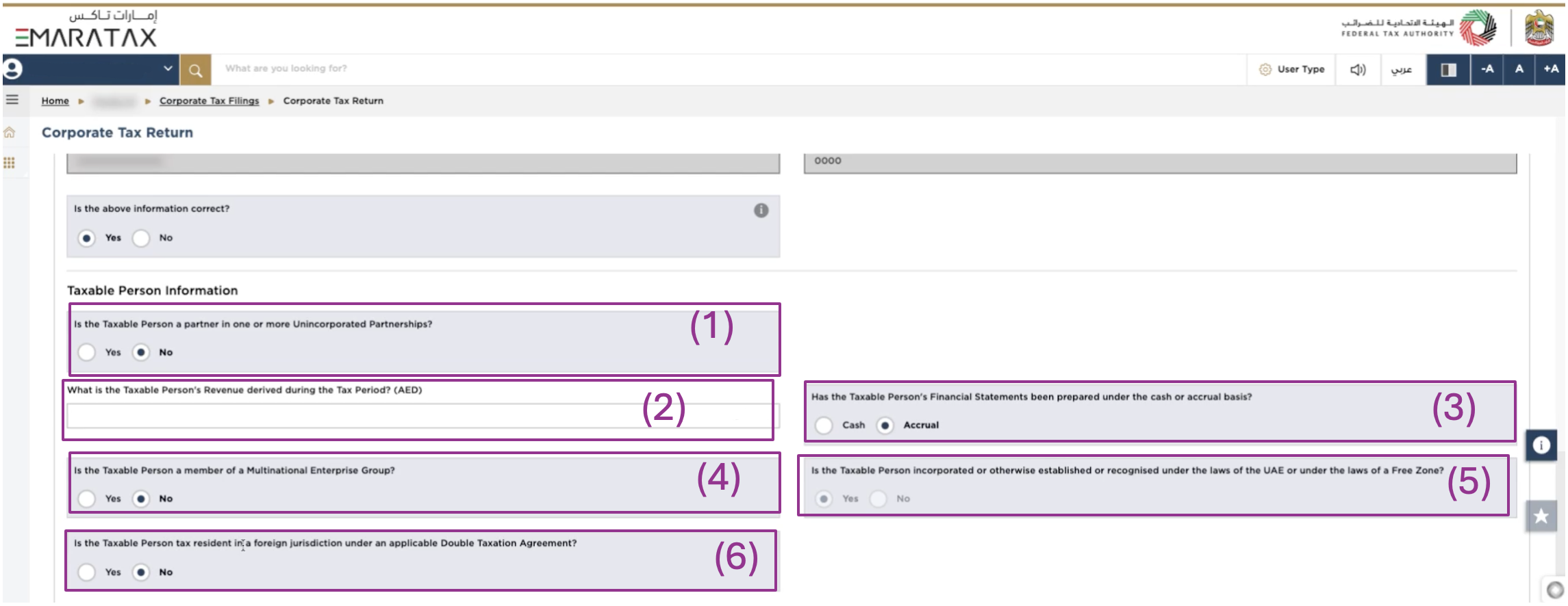 (5) Is the Taxable Person incorporated or otherwise established or recognized under the laws of the UAE or under the laws of a Free Zone?