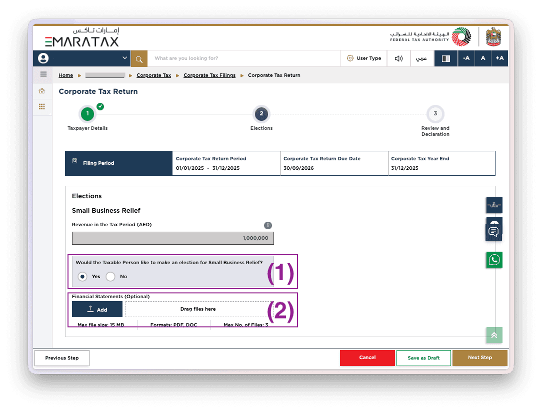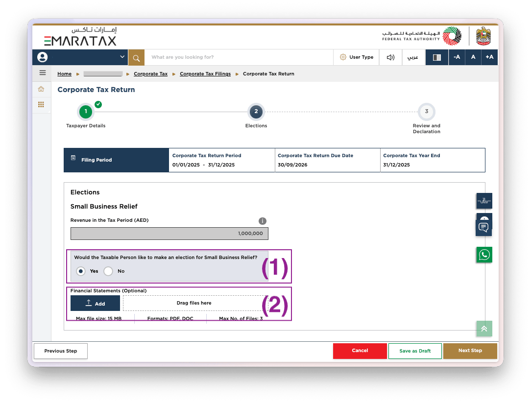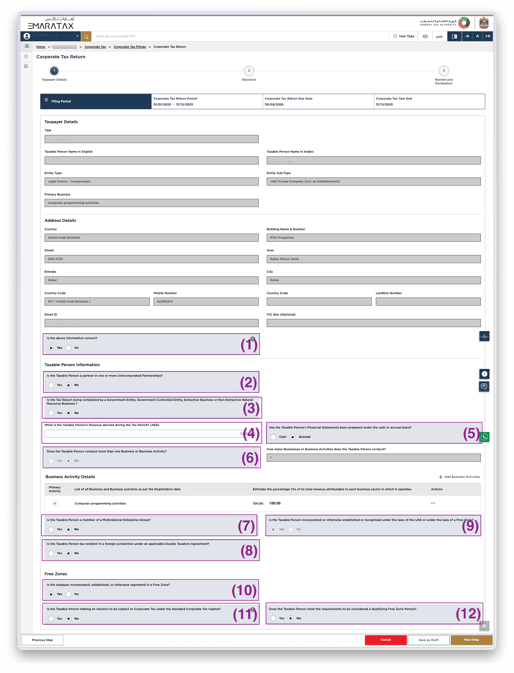 Press No – If the Tax Return is not being completed by a Government Entity, Government Controlled Entity, Extractive Business or Non-Extractive Natural Resource Business. (Most Naqood businesses)