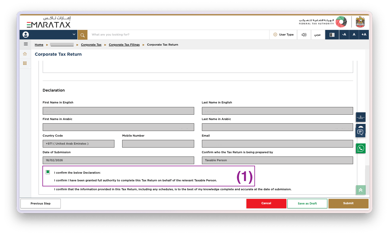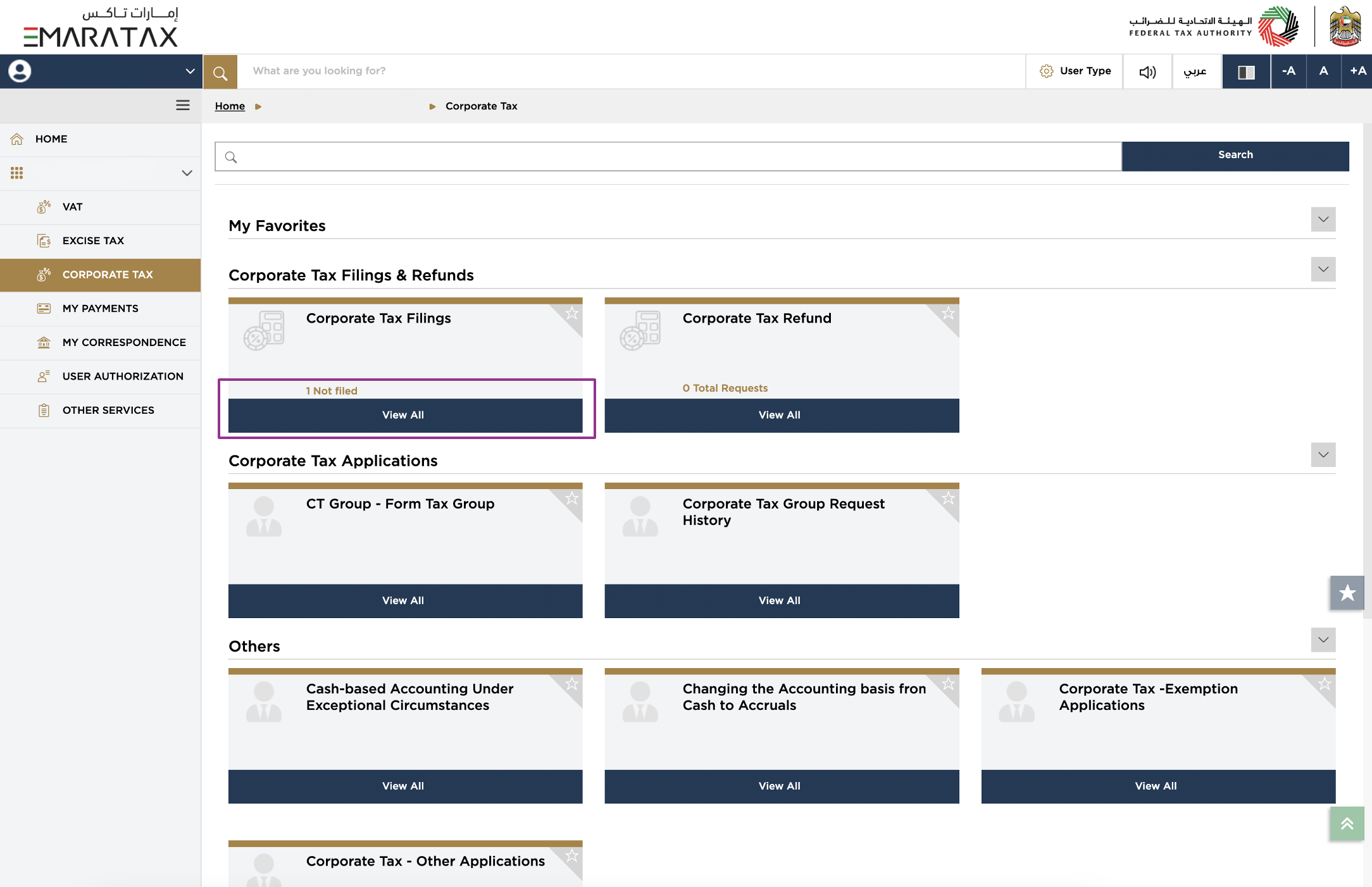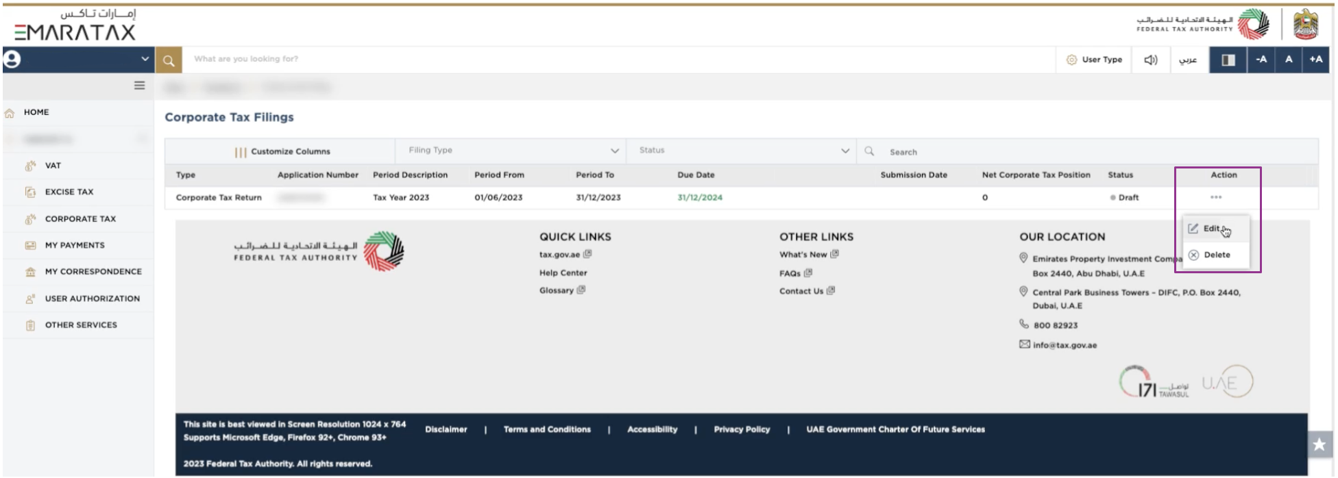 If the action does not appear, it means your corporate tax period has not yet ended or that the FTA hasn’t open for your filing. You will need to wait until it closes before you can file.