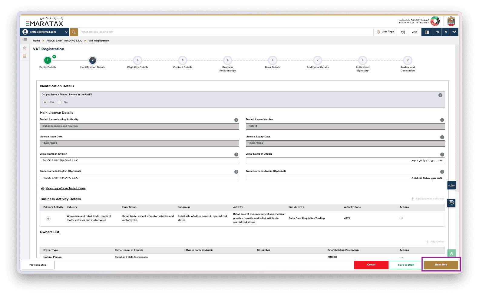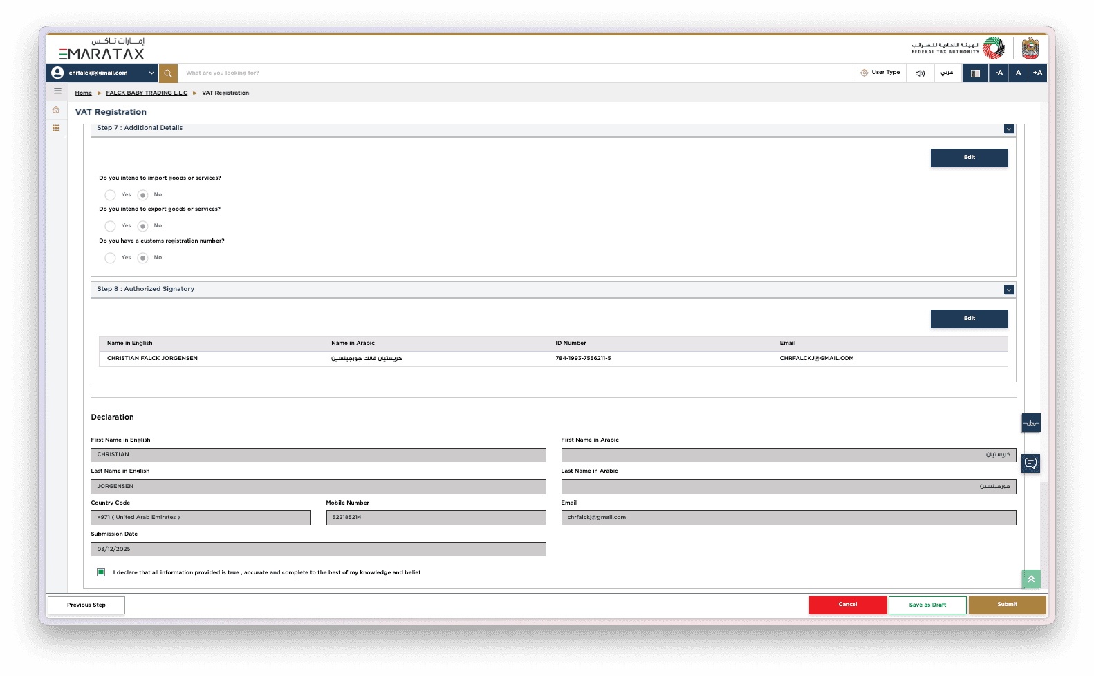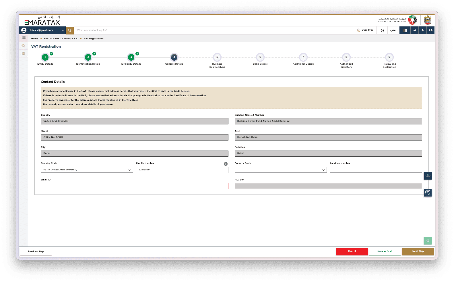 Review your details carefully, as the FTA uses this information for all VAT-related communication. Ensure your email address, phone number, and business location are fully accurate and up to date. Correct contact details help prevent delays in receiving your Tax Registration Number (TRN), clarification requests, or important compliance notifications.