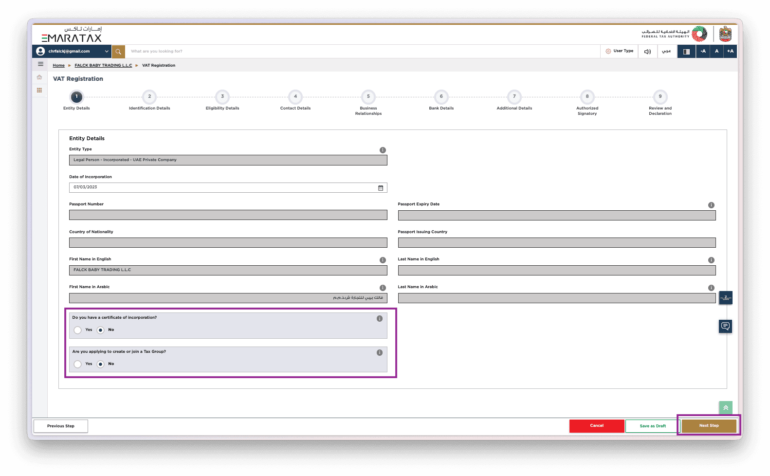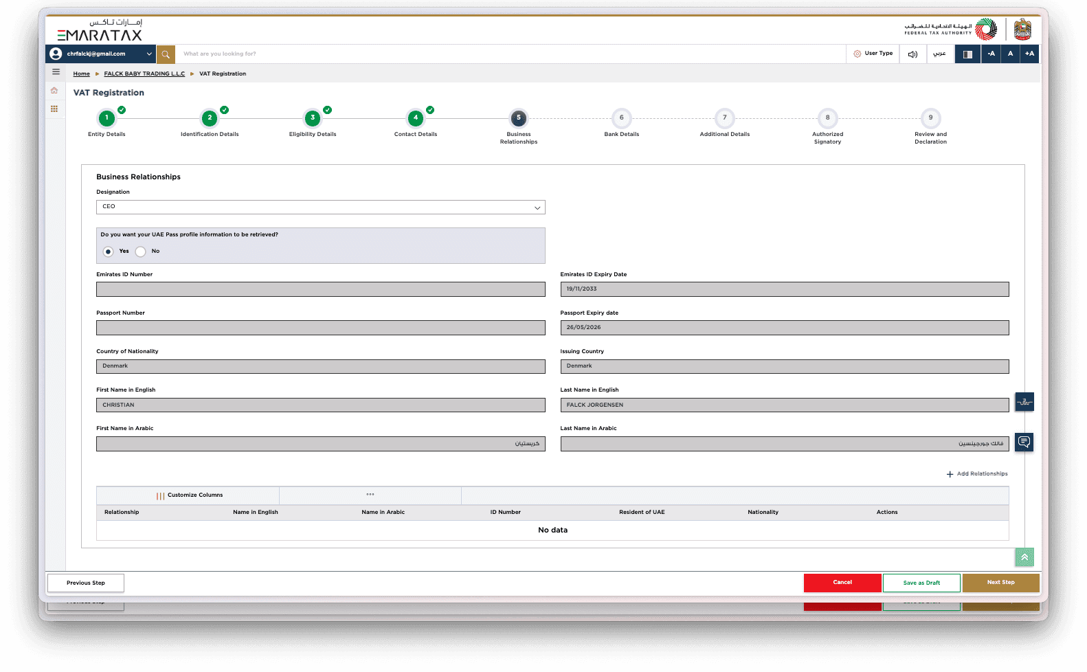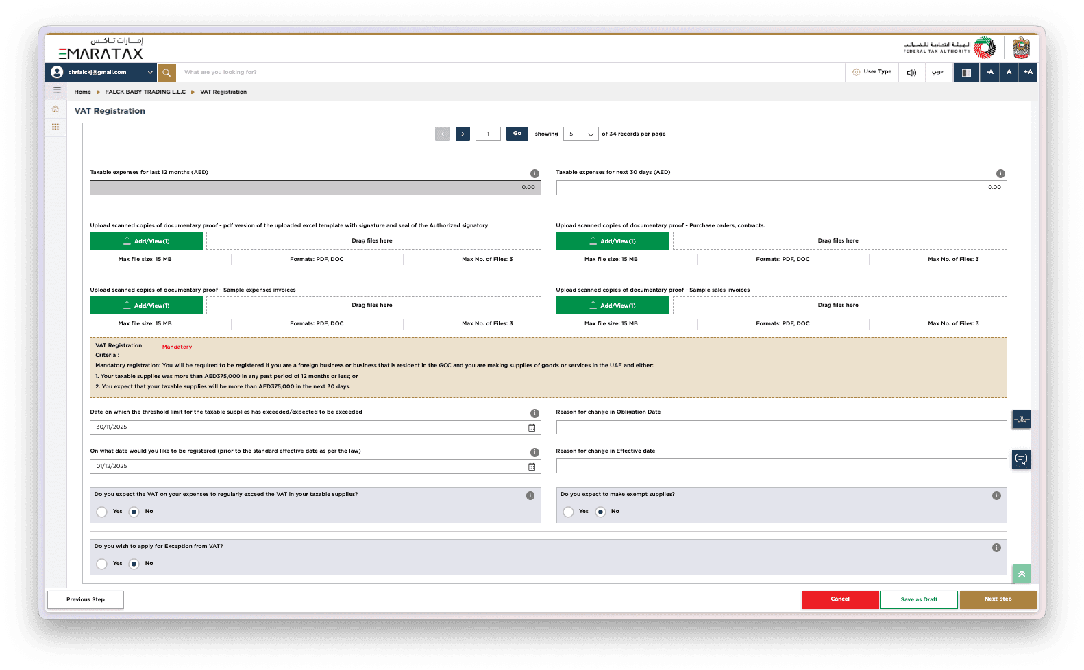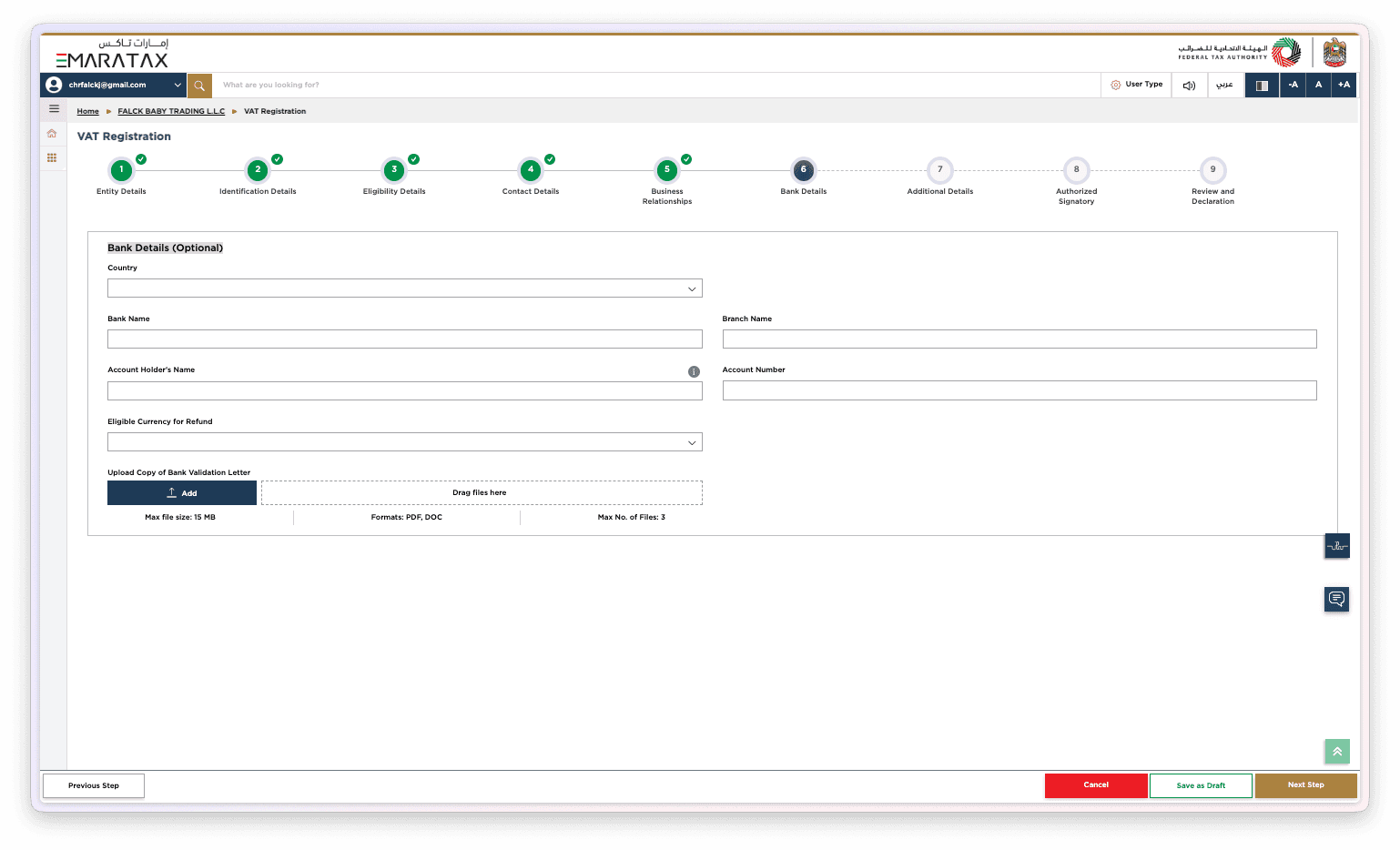 Review your details carefully, as the FTA uses this information for all VAT-related communication. Ensure your email address, phone number, and business location are fully accurate and up to date. Correct contact details help prevent delays in receiving your Tax Registration Number (TRN), clarification requests, or important compliance notifications.
