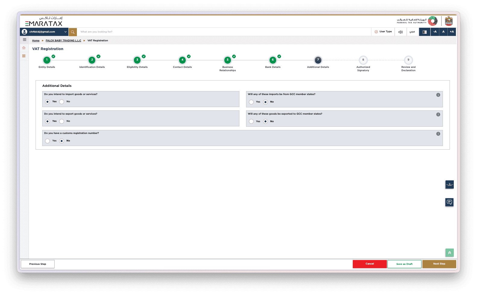 This section helps the FTA understand your business’s trade activities and whether you operate across borders. Answering accurately ensures you are placed under the correct VAT rules for imports, exports, and GCC transactions.