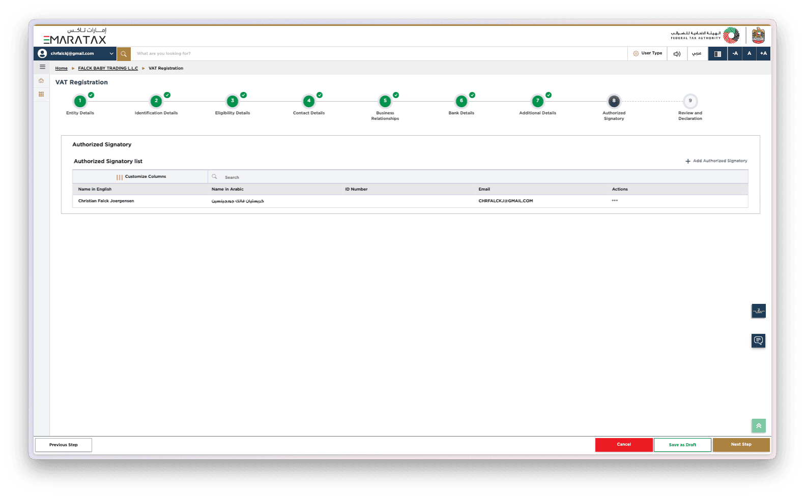 Confirm the authorised signatory who will be legally responsible for VAT compliance. This person must match your trade licence or supporting documents. Ensuring accuracy in this section prevents delays and ensures the FTA can validate your application quickly.