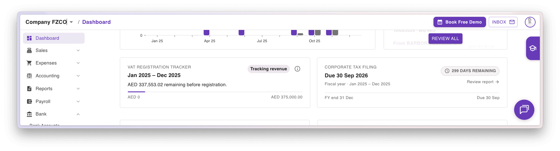 Naqood is designed to make VAT compliance simple and stress-free for business owners and accountants. Our built-in revenue tracker helps you monitor your taxable turnover so you always know when you are approaching the VAT registration threshold. We also include automated VAT filing reminders, ensuring you never miss an FTA deadline.