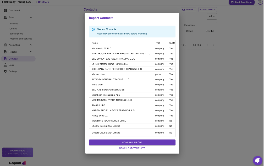 After verifying the imported data, click the Confirm Import button to complete the process. Your contacts are now successfully added to Naqood and are ready to use for invoicing, expense tracking, and VAT reporting.